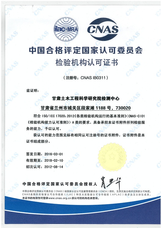 2012年2月首次依據(jù)CNAS-CL01建立了檢驗(yàn)機(jī)構(gòu)質(zhì)量管理體系,2012年8月初次通過(guò)國(guó)家檢驗(yàn)機(jī)構(gòu)認(rèn)可,檢驗(yàn)領(lǐng)域?yàn)榻ㄖ鼗?地基、樁基承載力試驗(yàn)與評(píng)價(jià))、建筑結(jié)構(gòu)(工程施工質(zhì)量評(píng)價(jià)、結(jié)構(gòu)設(shè)計(jì)復(fù)核、結(jié)構(gòu)抗震性能評(píng)價(jià)、結(jié)構(gòu)安全性與可靠性評(píng)價(jià))、建筑節(jié)能(圍護(hù)結(jié)構(gòu)節(jié)能性能施工質(zhì)量及評(píng)價(jià)、建筑物能耗及節(jié)能綜合指標(biāo)評(píng)價(jià))、混凝土(混凝土配合比質(zhì)量評(píng)定、混凝土質(zhì)量和生產(chǎn)過(guò)程質(zhì)量控制評(píng)定)。歷經(jīng)監(jiān)督檢查,換證復(fù)評(píng)審,持續(xù)有效運(yùn)行5年。